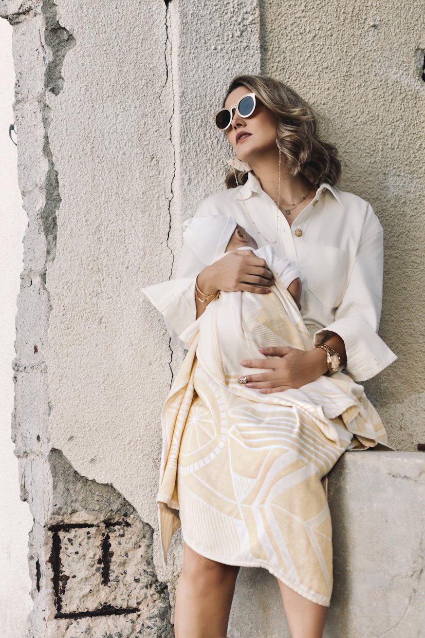This uniquely beautiful cuddly blanket with its geometric design is a real eye catcher - whether in the baby bed, in the stroller or as a stylish scarf around mum\'s neck! Woven in two cuddly layers of fabric, our Goldschatz cuddly blanket is made from the finest bamboo viscose, making it wonderfully fluffy and uniquely gentle on baby\'s delicate skin. This beautifully cuddle dream gently accompanies your baby to sleep and is also a stylish fashion accessory for you.